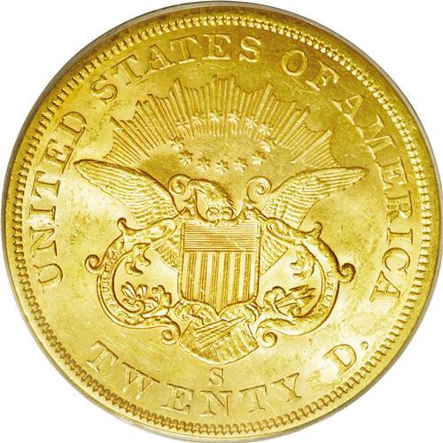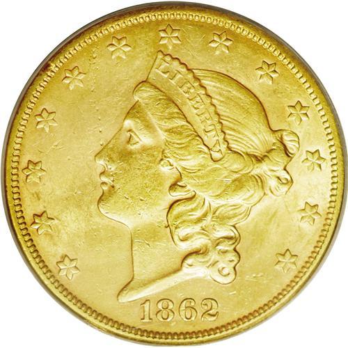 <B>1862-S<$20> AU55 PCGS.</B></I> Ex: <I>Brother Jonathan.</B></I> A sharp example with nearly full luster and a granular appearance on the upper left obverse field. The present piece is among the higher graded 1862-S double eagles recovered from the shipwreck, according to page 355 of Q. David Bowers' <I>The Treasure Ship S.S. Brother Jonathan.</B></I> A copy of this book accompanies the lot. The book lists ten AU55 pieces, along with a single AU58 and another listed as Net MS60.