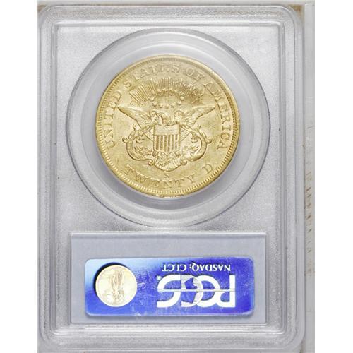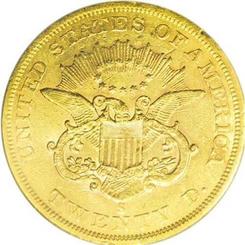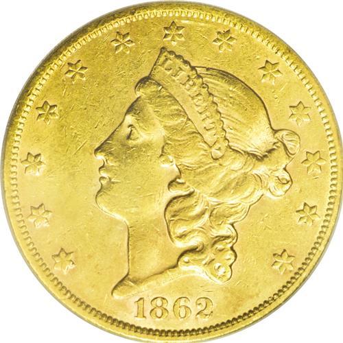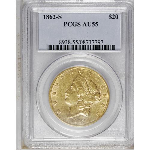 <B>1862-S<$20> AU55 PCGS.</B></I> This is one of the more common dates among Type One double eagles from San Francisco. Akers states that the average 1862-S is both well worn and bagmarked, however, and that an accurately graded AU example is rare. This piece shows numerous superficial abrasions and attractive green-gold and reddish patina throughout, with an impressive degree of remaining luster for the grade. Population: 30 in 55, 42 finer (9/06).