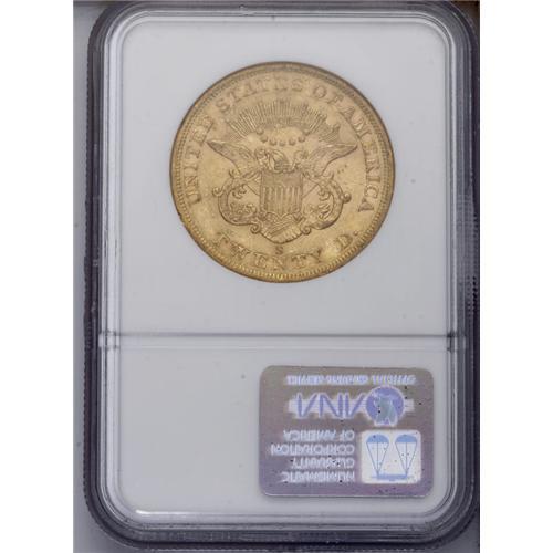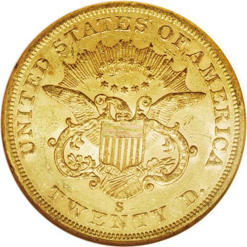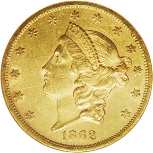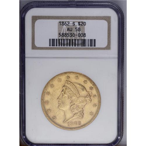 <B>1862-S $20 AU58 NGC.</B></I> Despite a respectable original mintage of 854,173 pieces, the 1862-S is one of the scarcest double eagles from this California branch mint. This moderately abraded example is superior to most extant '62-S twenties in that it shows only the lightest rub across the highpoints. The surfaces are slightly subdued and show delicate reddish-golden overtones.