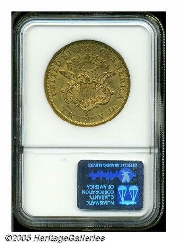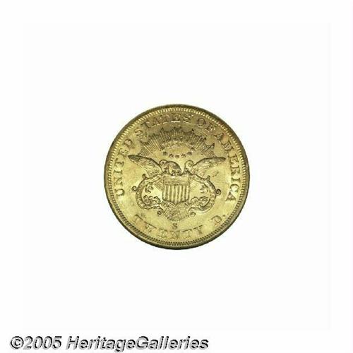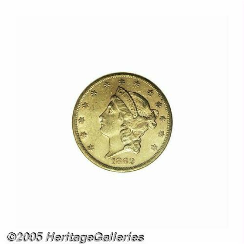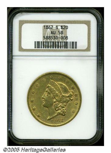 <B>1862-S<$20> AU58 NGC.</B></I> While minted in substantial numbers (854,173 pieces) the 1862-S Liberty double eagle is surprisingly difficult at all grade levels. It is quite scarce in higher circulated grades, and a rarity when fully Mint State. This example displays warm apricot-gold surfaces that retain some of the original mint luster. The design elements are well impressed, with no areas exhibiting notable weakness. A few minute contact marks are scattered about, as one would expect of a large, relatively heavy coin. NGC has certified only 25 specimens finer (6/05).