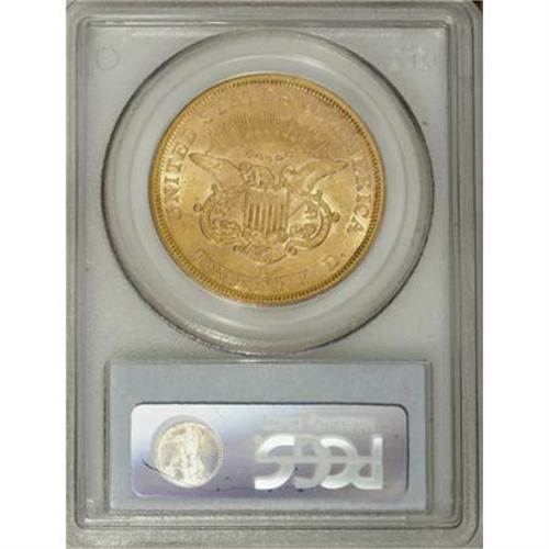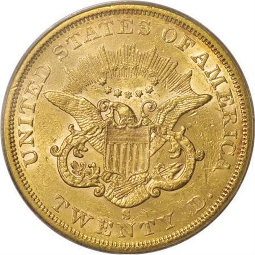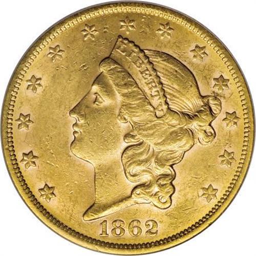 <B>1862-S $20 AU58 PCGS.</B></I> A Civil War issue once thought to be in short supply, the 1862-S double eagle had a surge in known population after the discovery of examples on a number of treasure ships. Still, the issue remains in high demand. This still-lustrous twenty's pale orange-gold surfaces have a number of short abrasions, though grade-defining friction appears only on the highpoints. An immensely appealing example. Population: 36 in 58, 11 finer (6/07).<BR><BR><B>Coin Engraver:</B> James B. Longacre<BR><BR><b>Shipping:</b> Coins & Currency (<a target="_blank" href="http://www.heritageauctions.com/common/shipping.php">view shipping information</a>\)