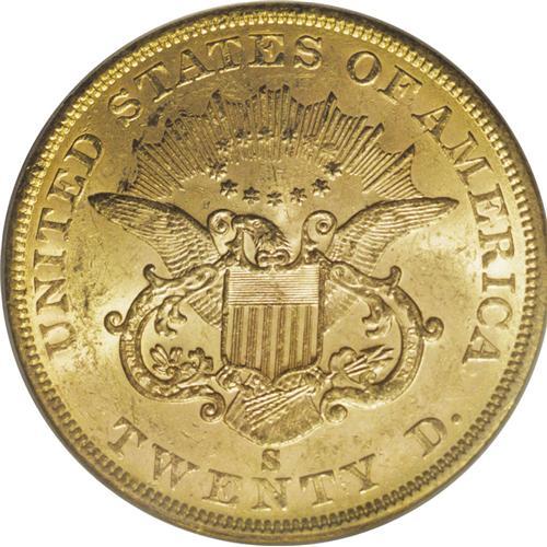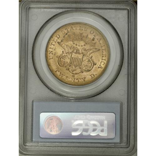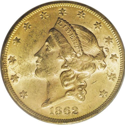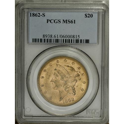 <B>1862-S $20 MS61 PCGS.</B></I> Double eagles were the bread and butter of the first San Francisco Mint, and the 1862-S had a typically generous production of 854,173 pieces. Since no one on the West Coast collected these costly bullion pieces in the 1860s, the entire issue went into circulation. The <I>S.S. Republic</B></I> and <I>S.S. Brother Jonathan</B></I> shipwrecks contained a number of 1862-S double eagles, but since those ships foundered three years later in 1865, most of the recovered pieces are in circulated grades.<BR> This is a lustrous example, nicely struck save for a couple of left-side obverse stars. Small to moderate marks are distributed, but no more than expected of the grade. The 8 in the date is lightly repunched. Population: 3 in 61, 7 finer (10/06).<BR><BR><b>Shipping:</b> Coin/Currency (<a target="_blank" href="http://www.heritageauctions.com/common/shipping.php">view shipping information</a>)