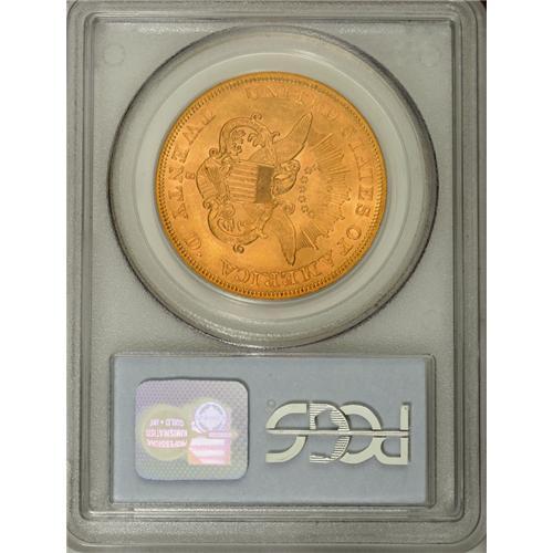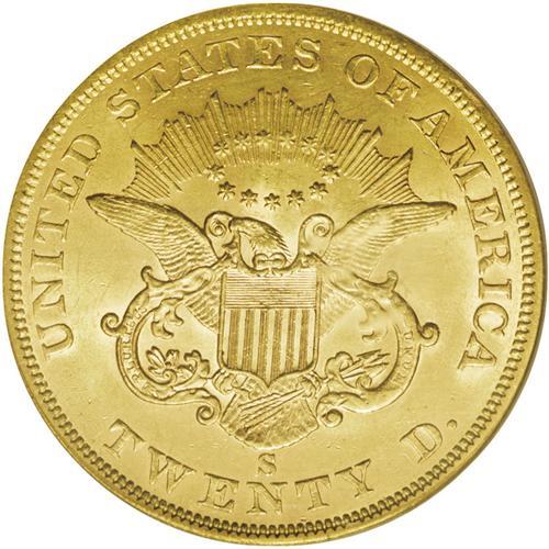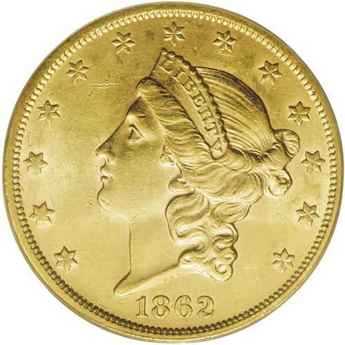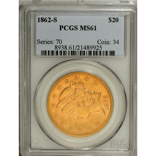 <B>1862-S $20 MS61 PCGS.</B></I> Even though the 1862-S had a mintage of 854,173 pieces, it is one of the scarcest double eagles from the San Francisco Mint. It is also conditionally challenging above XF. The lustrous, satin-like surfaces are very lightly abraded and the design elements are well defined throughout. An attractive, conservatively graded Mint State specimen. Population: 3 in 61, 7 finer (11/06).<BR><BR><b>Shipping:</b> Coin/Currency (<a target="_blank" href="http://www.heritageauctions.com/common/shipping.php">view shipping information</a>)