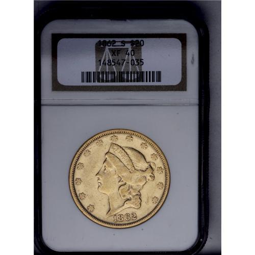 <B>1862-S<$20> XF40 NGC.</B></I> This example is still partially lustrous with a typical number of bagmarks, particularly over the obverse, and light wear. The strike is noticeably incomplete, probably due to improper striking pressure. <BR><BR><B>Important