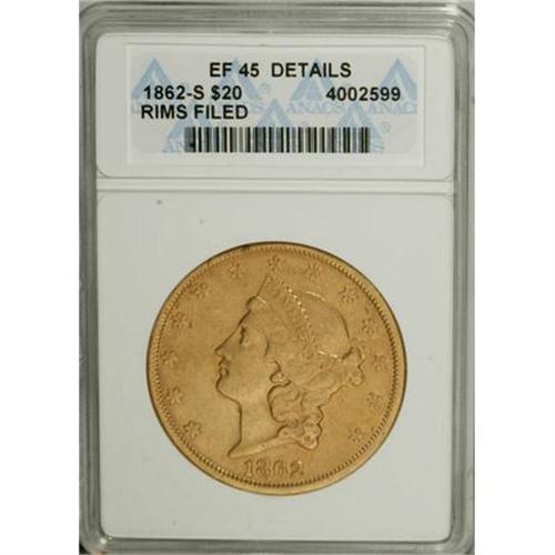 <B>1862-S $20 --Rim Filed--ANACS. XF45 Details.</B></I> NGC Census: (166/474). PCGS Population (138/198). Mintage: 854,173. Numismedia Wsl. Price for NGC/PCGS coin in XF45: $1,338. (#8938)<BR><BR><B>Coin Engraver:</B> James B. Longacre<BR><BR><b>Shipping:</b> Coins & Currency (<a target="_blank" href="http://www.heritageauctions.com/common/shipping.php">view shipping information</a>)