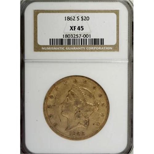 <B>1862-S $20 XF45 NGC.</B></I> Rich, antique-gold color is noted on both sides of this still slightly lustrous, and lightly circulated example. There are fewer marks than typically encountered on large coins in this grade.<BR><BR><B>Coin Engraver:</B> James B. Longacre<BR><BR><b>Shipping:</b> Coins & Currency (<a target="_blank" href="http://www.heritageauctions.com/common/shipping.php">view shipping information</a>)
