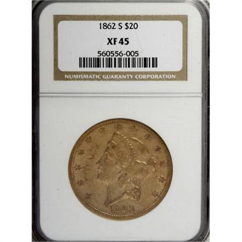 <B>1862-S $20 XF45 NGC.</B></I> Although it was produced in substantial numbers, the 1862-S twenty is surprisingly difficult at all grade levels and downright scarce in AU. Lots of minor marks are seen on both sides, a common element of large coins that have circulated for some time. Rich orange-gold in color and pleasant.<BR><BR><B>Coin Engraver:</B> James B. Longacre<BR><BR><b>Shipping:</b> Coins & Currency (<a target="_blank" href="http://www.heritageauctions.com/common/shipping.php">view shipping information</a>)