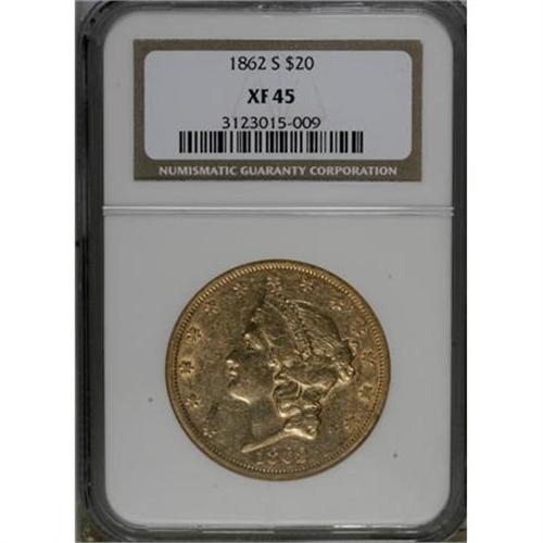 <B>1862-S $20 XF45 NGC.</B></I> A still-lustrous, lightly circulated example of this Civil War-era S-mint issue, well struck with a number of small, scattered marks across the fields. A handful of abrasions are present on the portrait.<BR><BR><B>Coin Engraver:</B> James B. Longacre<BR><BR><b>Shipping:</b> Coins & Currency (<a target="_blank" href="http://www.heritageauctions.com/common/shipping.php">view shipping information</a>)