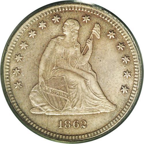 <B>1862-S 25C MS62 PCGS.</B></I> A very rare coin in any high grade, particularly so in mint state grades as found here. The obverse strike is a touch weak on Liberty's hair and breast, but the reverse is quite bold, particularly on the eagle's claws and thighs. Toned an even slate gray on the obverse and reverse and a bit dull. The reverse die sports a huge mintmark which is approximately the size of the peripheral letters. The original mintage of 67,000 pieces was devoured by time and attrition making this one of the scarcer dates in the series. Housed in an older green insert PCGS holder. Population: 4 in 62, 4 finer (12/05).