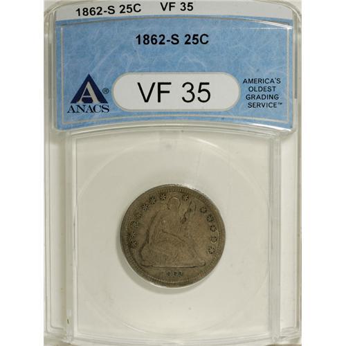 <B>1862-S 25C VF35 ANACS.</B></I> NGC Census: (5/22). PCGS Population (0/20). Mintage: 67,000. Numismedia Wsl. Price: $345. (#5457)<BR><BR><b>Shipping:</b> Coins & Currency (<a target="_blank" href="http://www.heritageauctions.com/common/shipping.php">view shipping information</a>)