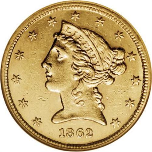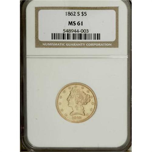 <B>1862-S $5 MS61 NGC.</B></I> As the Civil War raged in the East, two states of the Union, California and Oregon, remained largely isolated from the conflict's economic effects. While the specie-starved federal government ceased payments in gold and private citizens hoarded coins of all kinds, the West Coast states remained awash in precious metal, and the San Francisco Mint's production of double eagles remained strong, as many Californians strongly distrusted paper currency. As Q. David Bowers (2004) wrote in <I>A Guide Book of Double Eagle Gold Coins</B></I>, "the double eagle reigned supreme as the coin of choice in many transactions and of necessity in large ones." That facility's output of lower-valued gold coins, however, was unsteady and subject to continually fluctuating demand for what passed as "small change." Of the quarter eagles and half eagles that the Mint coined, almost all entered circulation and stayed there, and many of the examples bought and sold today have significant wear.<BR> It comes as little surprise, then, that Mint State representatives of any Civil War-era half eagle issue are condition rarities, and for the 1862-S, which has a tiny original mintage of just 9,500 pieces, just three such coins appear in the certified populations of NGC and PCGS combined (6/07). This attractive example has lovely, shimmering luster and light yellow-gold surfaces with delicate straw-colored accents. Both sides exhibit crisp detail, and while scattered abrasions preclude a finer grade, the overall eye appeal is strong. A wonderful opportunity to own an example of this elusive issue in a top-notch grade.<BR><BR><B>Coin Engraver:</B> Christian Gobrecht<BR><BR><b>Shipping:</b> Coins & Currency (<a target="_blank" href="http://www.heritageauctions.com/common/shipping.php">view shipping information</a>\)