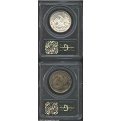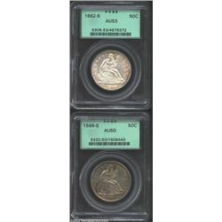 1862-S 50C AU53 PCGS, well brought up in all areas with a hint of golden toning around the obverse periphery; and an 1866-S AU50 PCGS, deep golden-brown toning.From the Ohio Collection. 2 coins Important notice: We expect to be auctioning lots at the rate of 200-250 per hour. Sometimes eBay Premier live bid software cannot keep up with that pace, so we strongly recommend that you place a realistic proxy bid now as insurance to avoid disappointment. Also please note that all Heritage/CAA lots purchased through eBay Premier carry a 20% Buyer's Premium. Please make sure you read the Terms and Conditions.