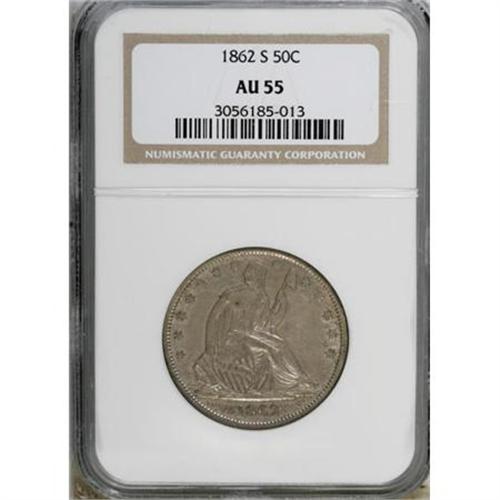 <B>1862-S 50C AU55 NGC.</B></I> NGC Census: (10/28). PCGS Population (6/33). Mintage: 1,352,000. Numismedia Wsl. Price for NGC/PCGS coin in AU55: $275. (#6308)<BR><BR><B>Coin Engraver:</B> Christian Gobrecht<BR><BR><b>Shipping:</b> Coins & Currency (<a target="_blank" href="http://www.heritageauctions.com/common/shipping.php">view shipping information</a>)