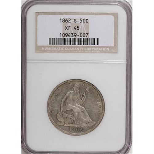 <B>1862-S 50C XF45 NGC.</B></I> NGC Census: (11/43). PCGS Population (2/48). Mintage: 1,352,000. Numismedia Wsl. Price for NGC/PCGS coin in XF45: $163. (#6308)<BR><BR><B>Coin Engraver:</B> Christian Gobrecht<BR><BR><b>Shipping:</b> Coins & Currency (<a target="_blank" href="http://www.heritageauctions.com/common/shipping.php">view shipping information</a>)