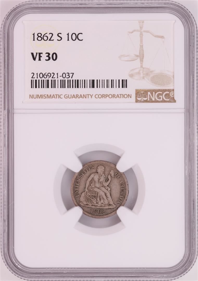 One 1862-S Seated Liberty Dime Coin NGC VF30. NGC Certified.