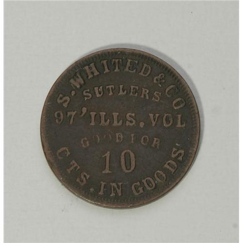 <B>1862 S. Whited & Co. Sutler Token XF40 Lightly Cleaned Uncertified.</B></I> Schenkman-IL-Q10C, R.6. Fuld-NL-39a. A deep brown example of this Illinois Volunteers variety. This mildly granular piece has been lightly wiped, but has relatively sharp details, and lacks the extensive corrosion that sutler tokens often display.<BR><BR><b>Shipping:</b> Coin/Currency (<a target="_blank" href="http://www.heritageauctions.com/common/shipping.php">view shipping information</a>)