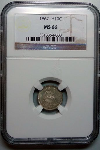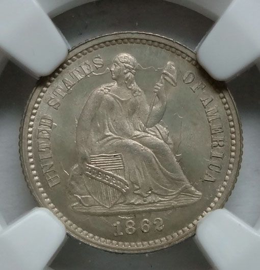 A NICE HIGH GRADE 1862 HALF DIME, RARE IN THIS CONDITION, EST. $1000.00 TO $1100.00