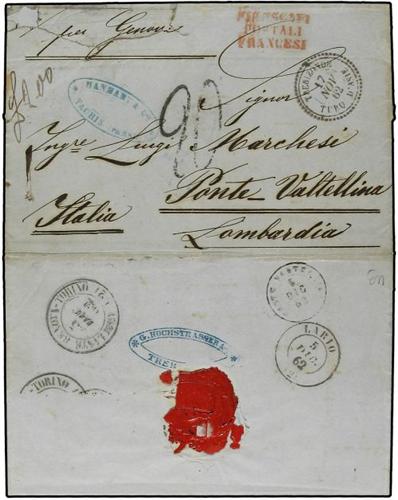 1862 TAURIS a ITALIA. Carta con texto con marca comercial en el frente HANHART/TAURIS (PERSIA) encaminada hasta TREBIZONDE, al dorso marca ovalada del Encaminador G. HOCHSTRASSER/TREBIZONDE y entregada al correo francés. Fechador en el frente TREBIZONDE/TURQ. D´ASIE, tasada por el correo francés con "20" (décimas). MUY RARA.