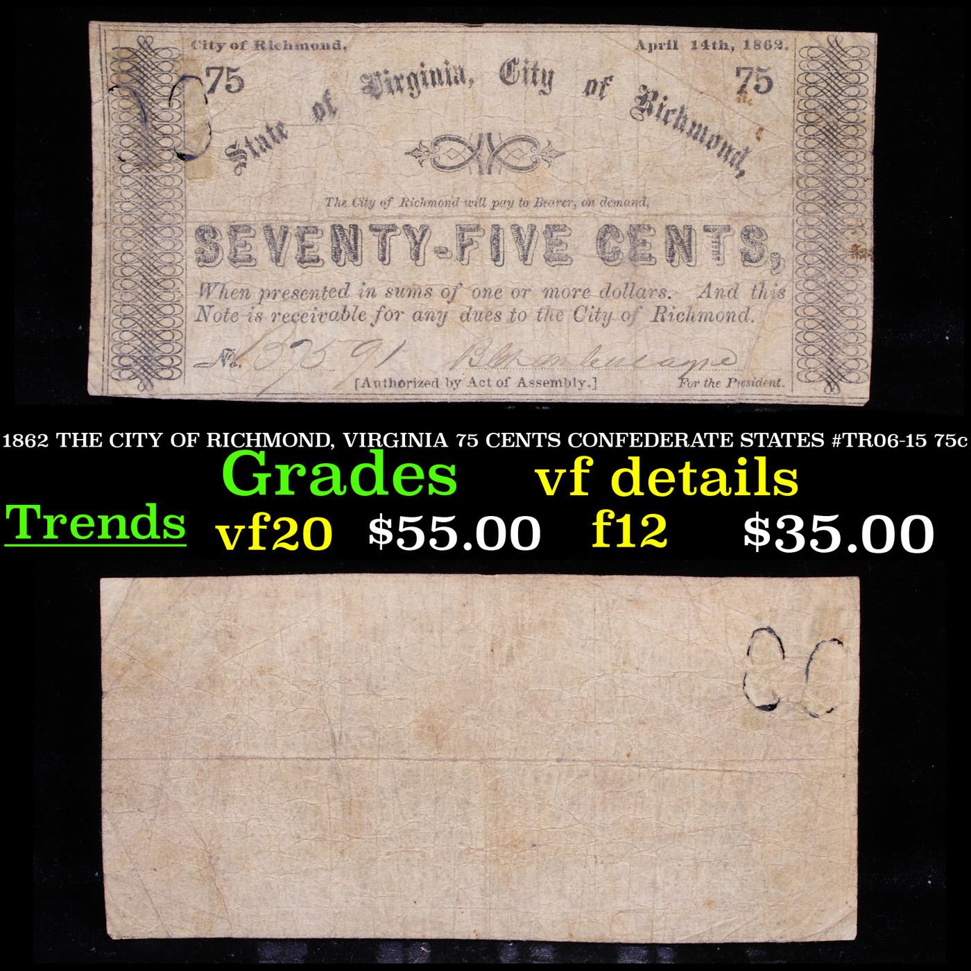 1862 THE CITY OF RICHMOND, VIRGINIA 75 CENTS CONFEDERATE STATES #TR06-15 75c Grades vf details