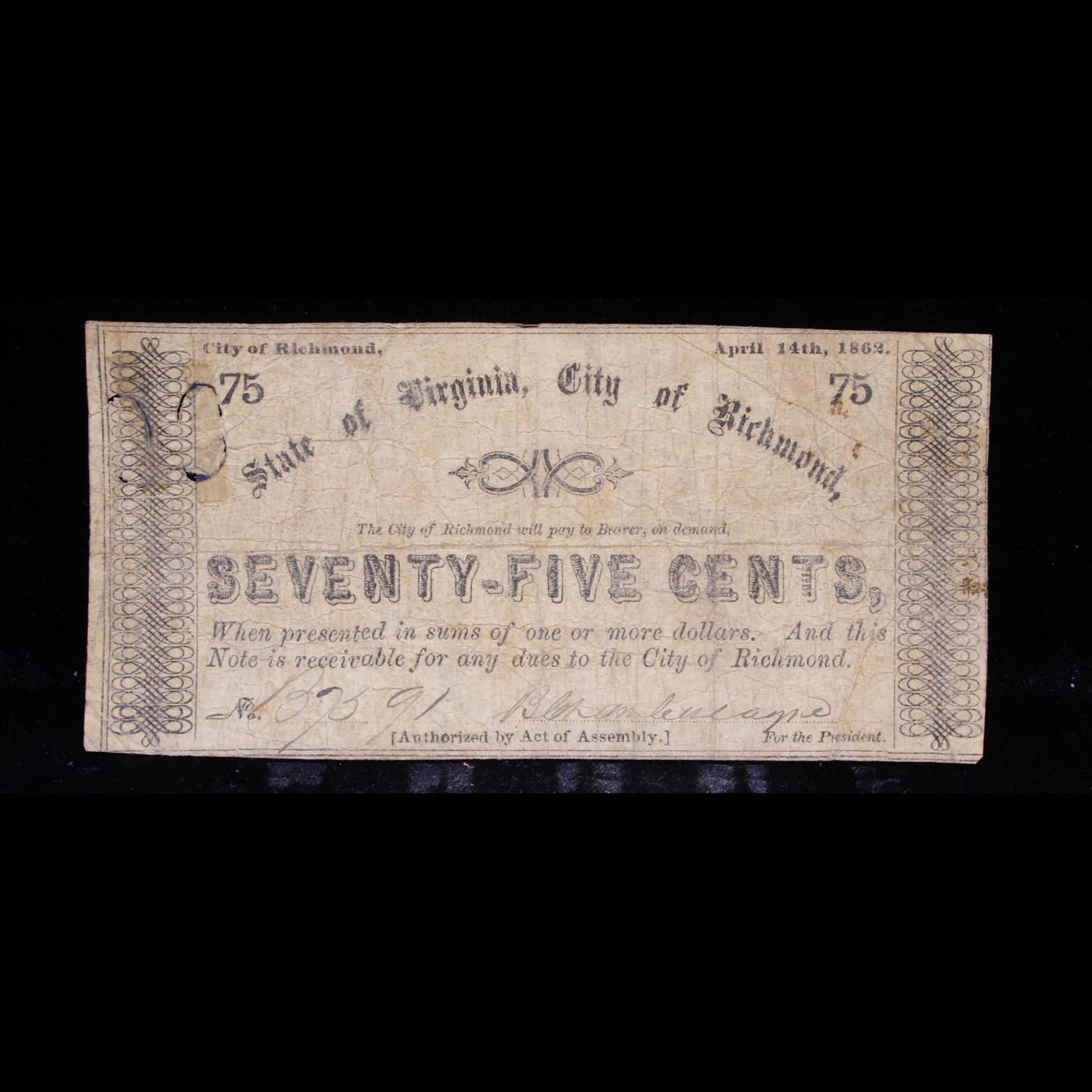 1862 THE CITY OF RICHMOND, VIRGINIA 75 CENTS CONFEDERATE STATES #TR06-15 75c Grades vf details.