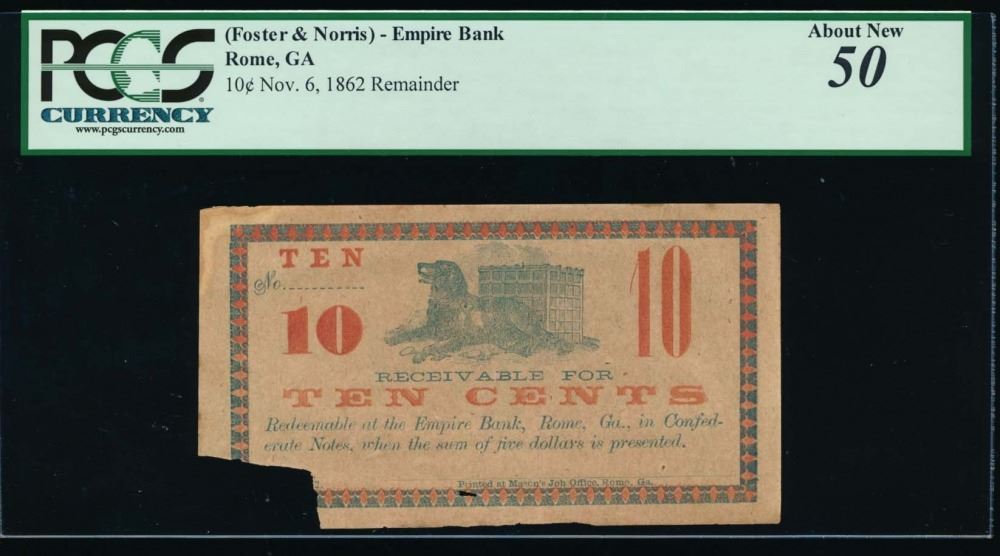 One 1862 Ten Cent Empire Bank Note PCGS 50.