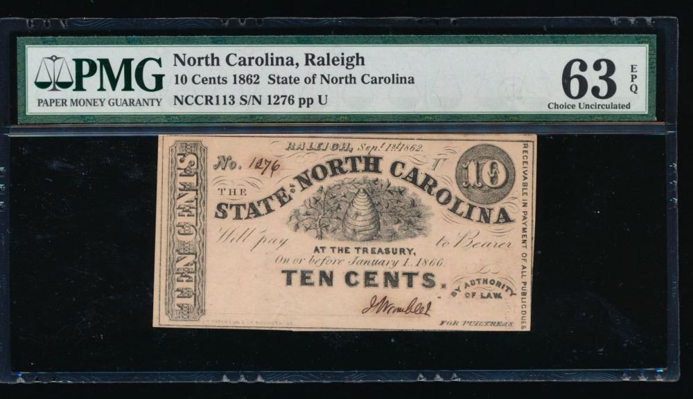 One 1862 Ten Cent Raleigh NC Obsolete Note PMG 63EPQ.