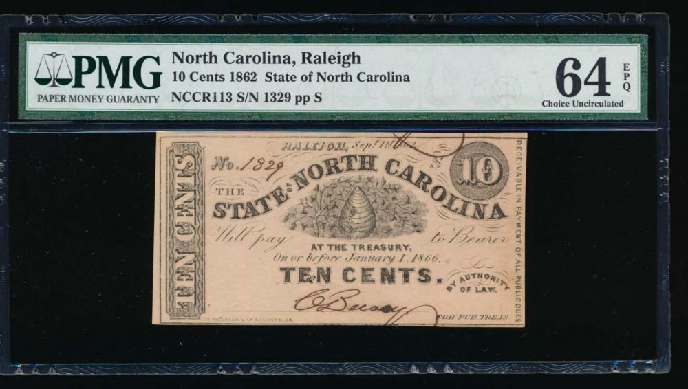 One 1862 Ten Cent Raleigh NC Obsolete Note PMG 64EPQ.