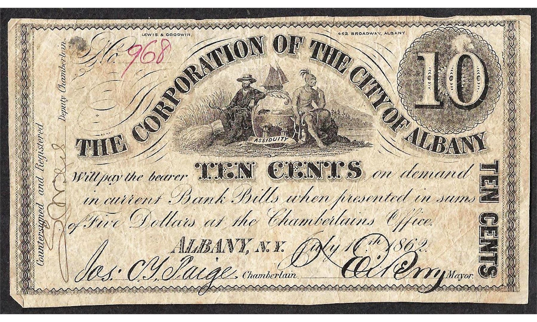 One 1862 Ten Cents The Corporation of the City of Albany Obsolete Note.
