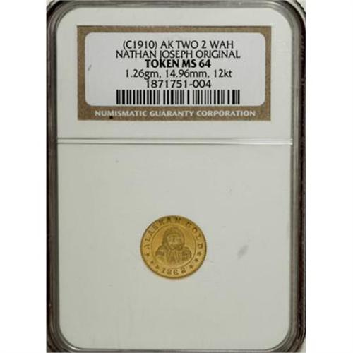 <B>"1862" Two TooWah Alaskan Gold MS64 NGC.</B></I> Gould-Bressett 108. 12-kt gold, 1.26 gm, 14.96 mm. An original (circa 1910) striking by Nathan Joseph. A lustrous and penetratingly struck yellow-gold near-Gem with a problem-free appearance. The reason for the 1862 date is obscure. Alaska became a U.S. territory in 1867.<BR><BR><b>Shipping:</b> Coins & Currency (<a target="_blank" href="http://www.heritageauctions.com/common/shipping.php">view shipping information</a>)