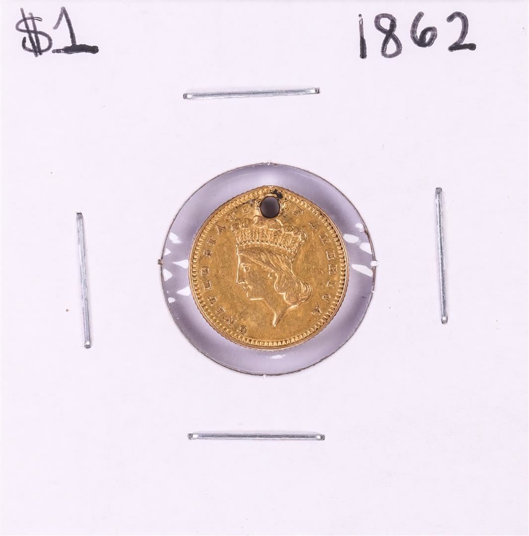 1862 Type 3 $1 Indian Princess Head Gold Dollar Coin with Hole