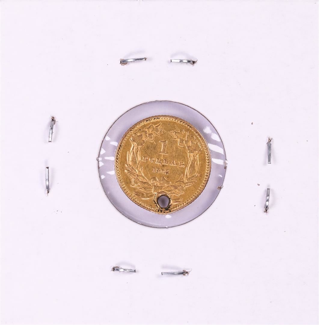 One 1862 Type 3 $1 Indian Princess Head Gold Dollar Coin with Hole.