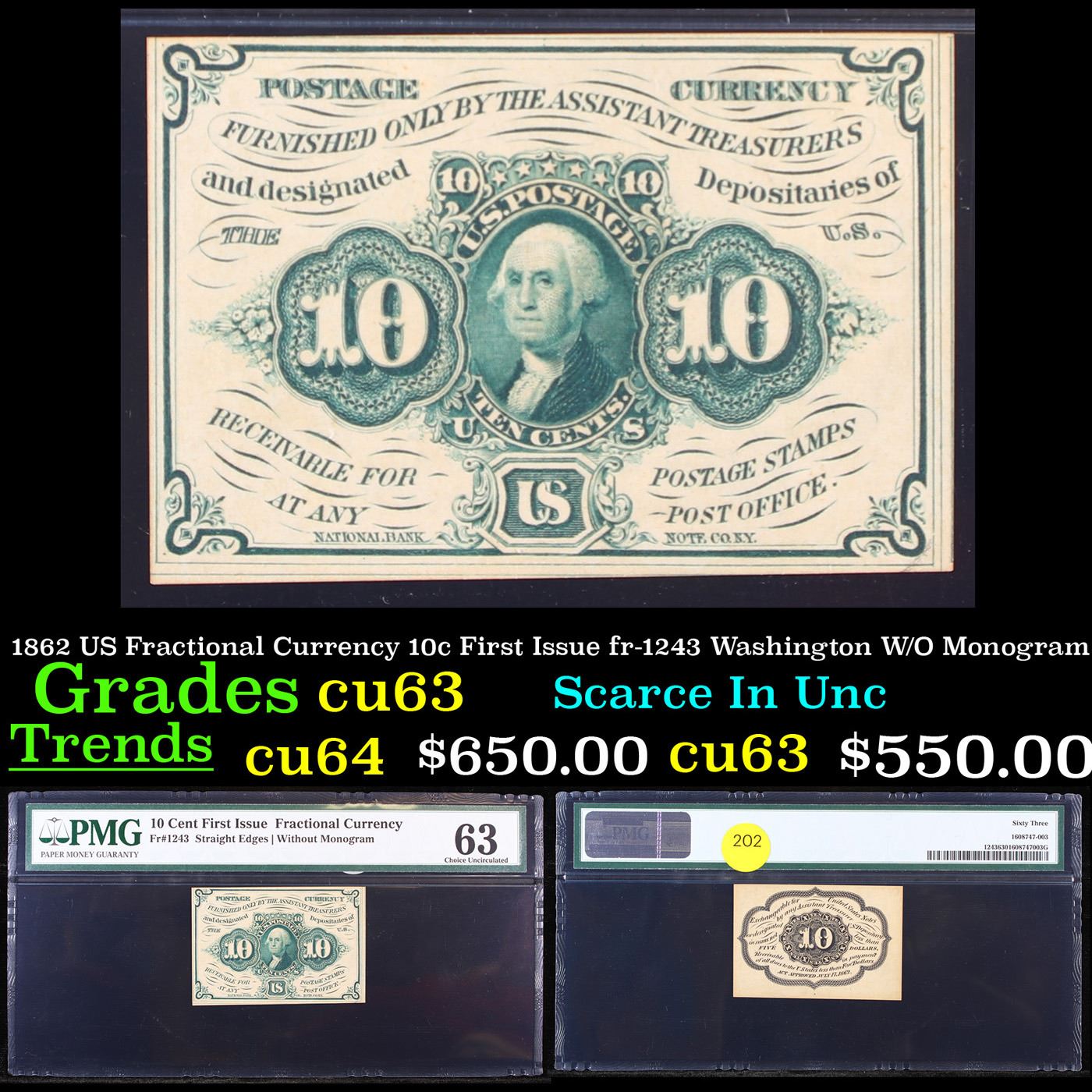 1862 US Fractional Currency 10c First Issue fr-1243 Washington W/O Monogram Graded cu63 By PMG