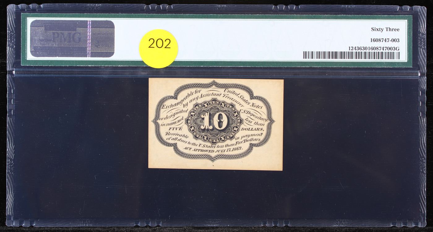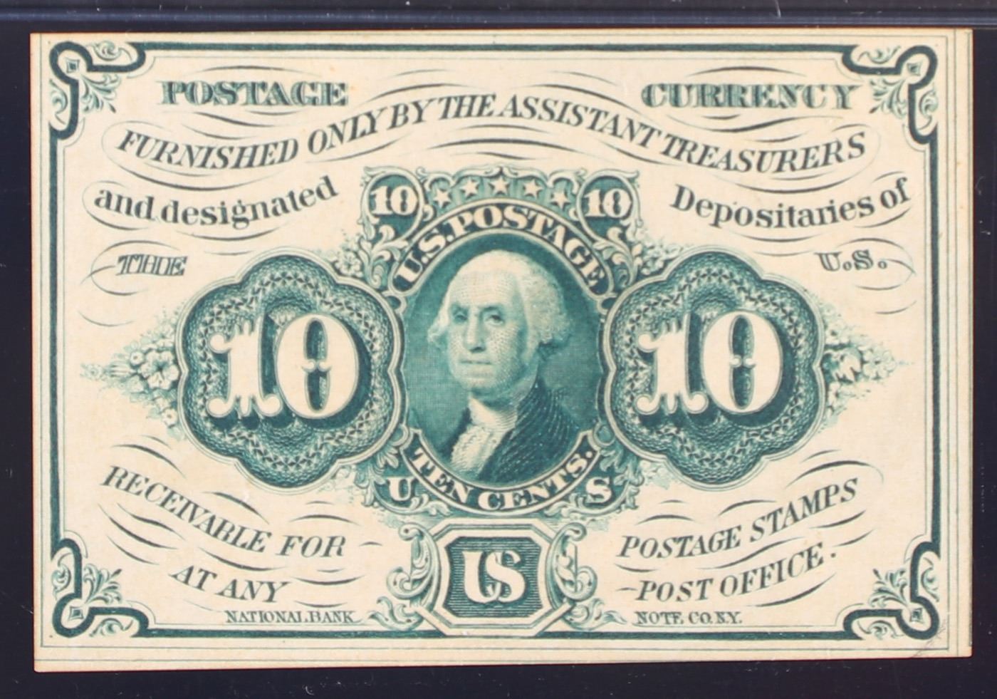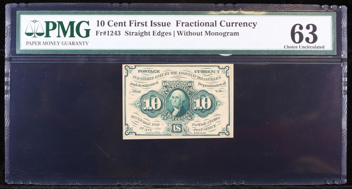 1862 US Fractional Currency 10c First Issue fr-1243 Washington W/O Monogram Graded cu63 By PMG. Fractional or postage currency has a rich history. At the beginning of the Civil War people starting hoarding coins for their precious metal content. Coins became difficult to find because of the hoarding. People started to try to use stamps instead of coins as a means of commerce. The government decided to help ease the hoarding issue by issuing “paper coins” also known as postage currency or fractional currency. Fractional currency was first issued on August 21, 1862 and they were last issued on February 15, 1876. Three cents, five cents, ten cents, twenty-five cents, and fifty cents notes were all issued. Fractional currency is physically smaller than other United States money. It also does not have a serial number.