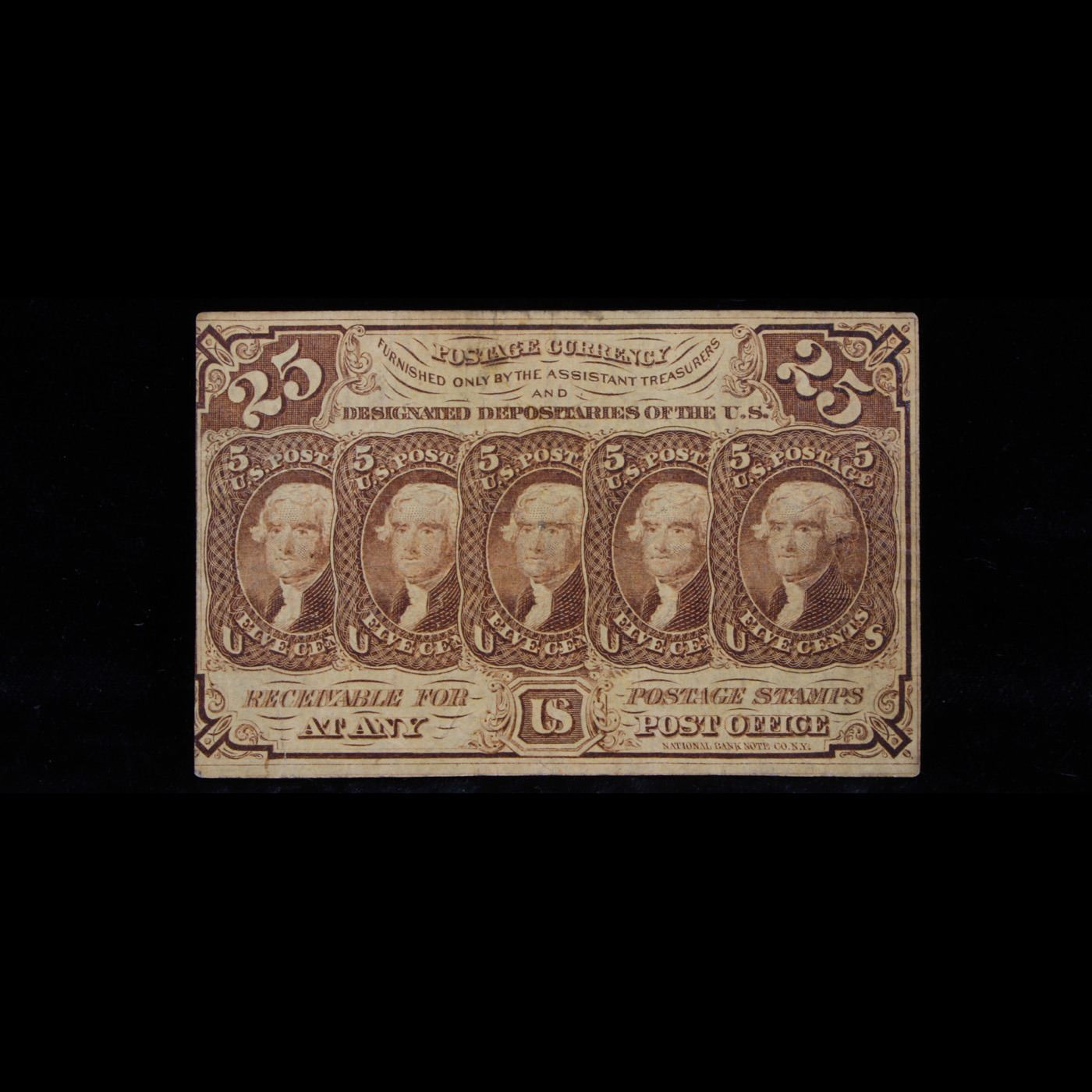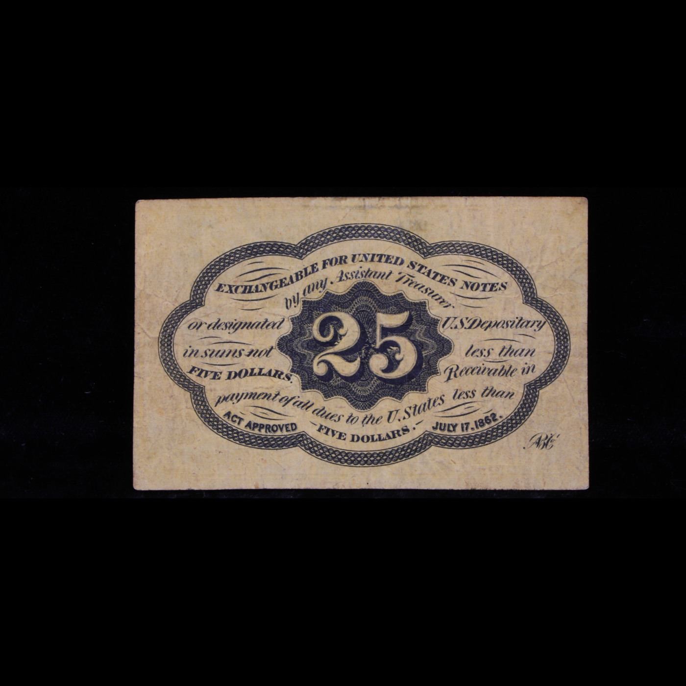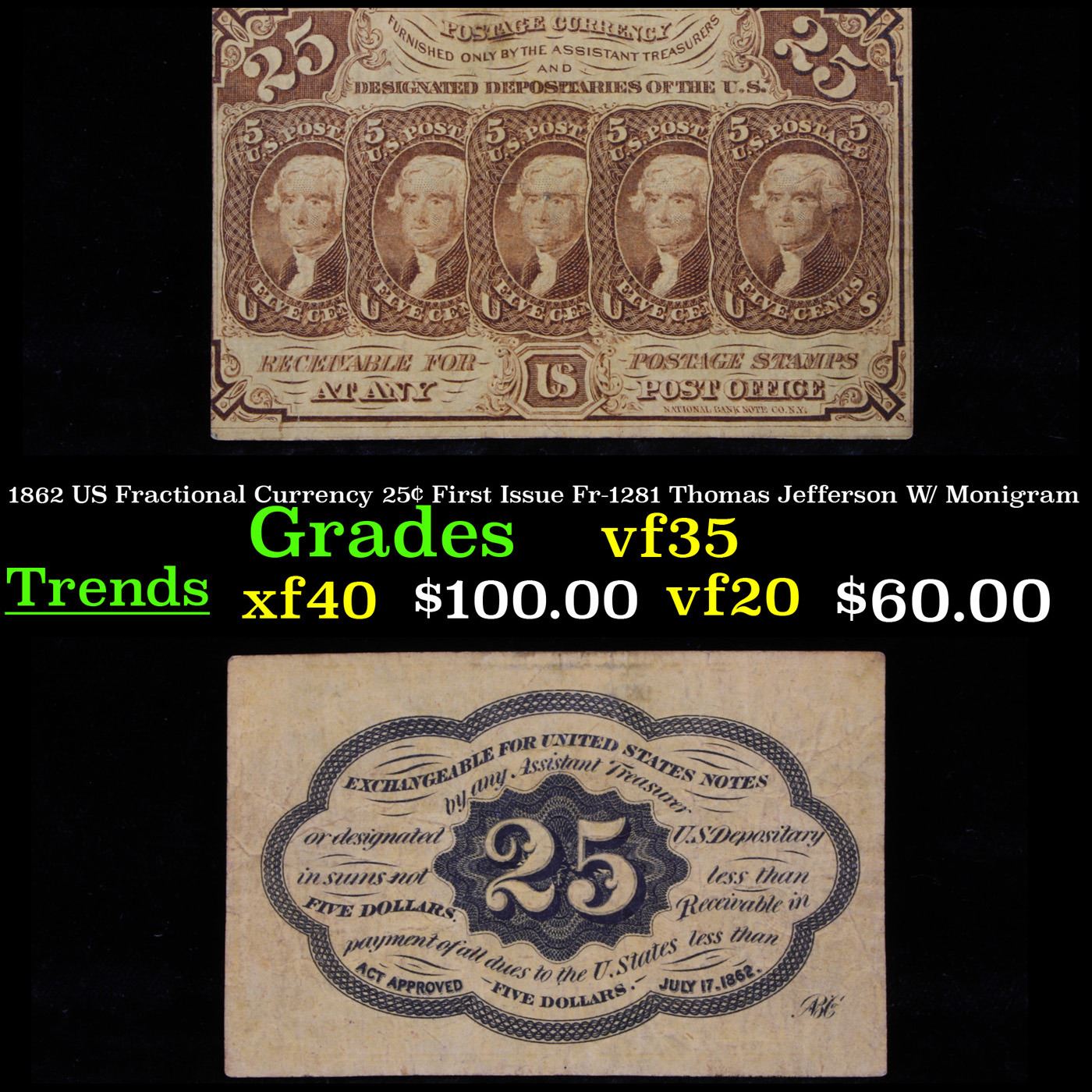 1862 US Fractional Currency 25¢ First Issue Fr-1281 Thomas Jefferson W/ Monigram Grades vf++. Fractional or postage currency has a rich history. At the beginning of the Civil War people starting hoarding coins for their precious metal content. Coins became difficult to find because of the hoarding. People started to try to use stamps instead of coins as a means of commerce. The government decided to help ease the hoarding issue by issuing “paper coins” also known as postage currency or fractional currency. Fractional currency was first issued on August 21, 1862 and they were last issued on February 15, 1876. Three cents, five cents, ten cents, twenty-five cents, and fifty cents notes were all issued. Fractional currency is physically smaller than other United States money. It also does not have a serial number. William Meredith is pictured on the front.