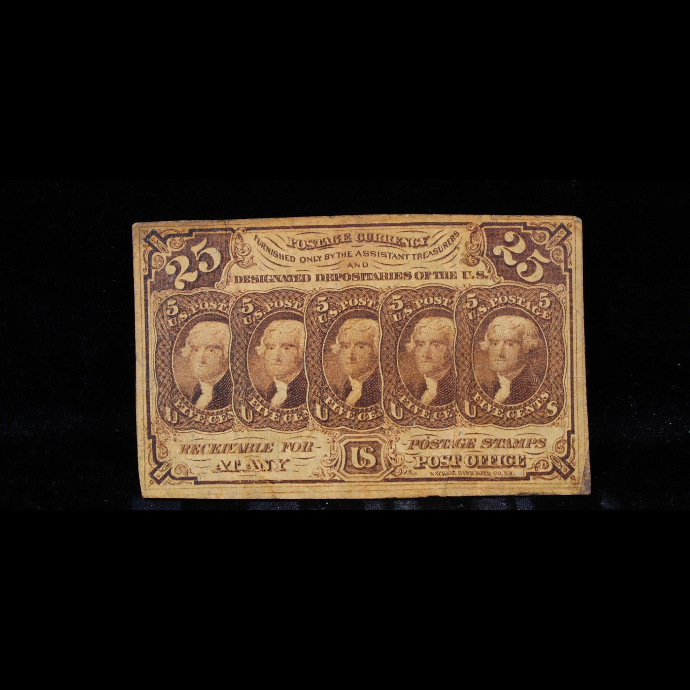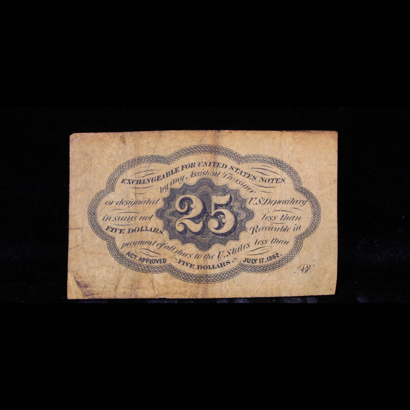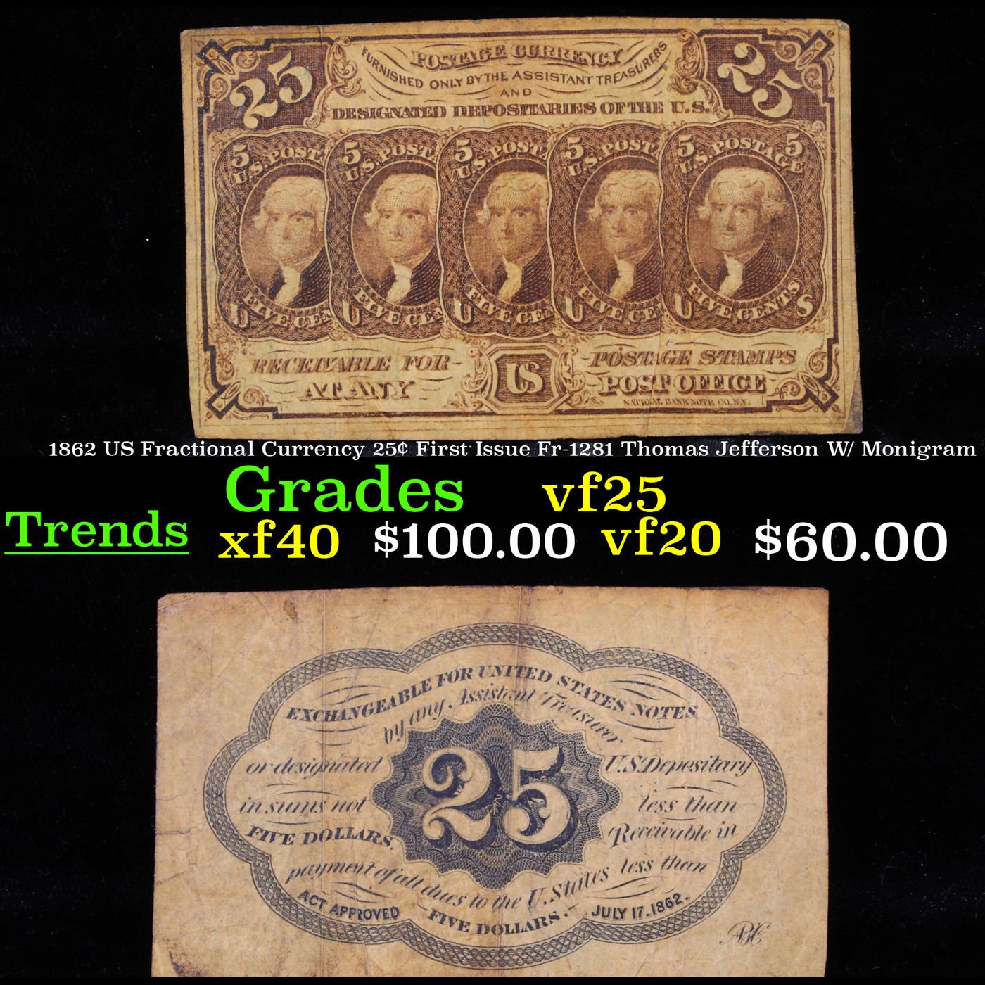 1862 US Fractional Currency 25¢ First Issue Fr-1281 Thomas Jefferson W/ Monigram Grades vf+. Fractional or postage currency has a rich history. At the beginning of the Civil War people starting hoarding coins for their precious metal content. Coins became difficult to find because of the hoarding. People started to try to use stamps instead of coins as a means of commerce. The government decided to help ease the hoarding issue by issuing “paper coins” also known as postage currency or fractional currency. Fractional currency was first issued on August 21, 1862 and they were last issued on February 15, 1876. Three cents, five cents, ten cents, twenty-five cents, and fifty cents notes were all issued. Fractional currency is physically smaller than other United States money. It also does not have a serial number.