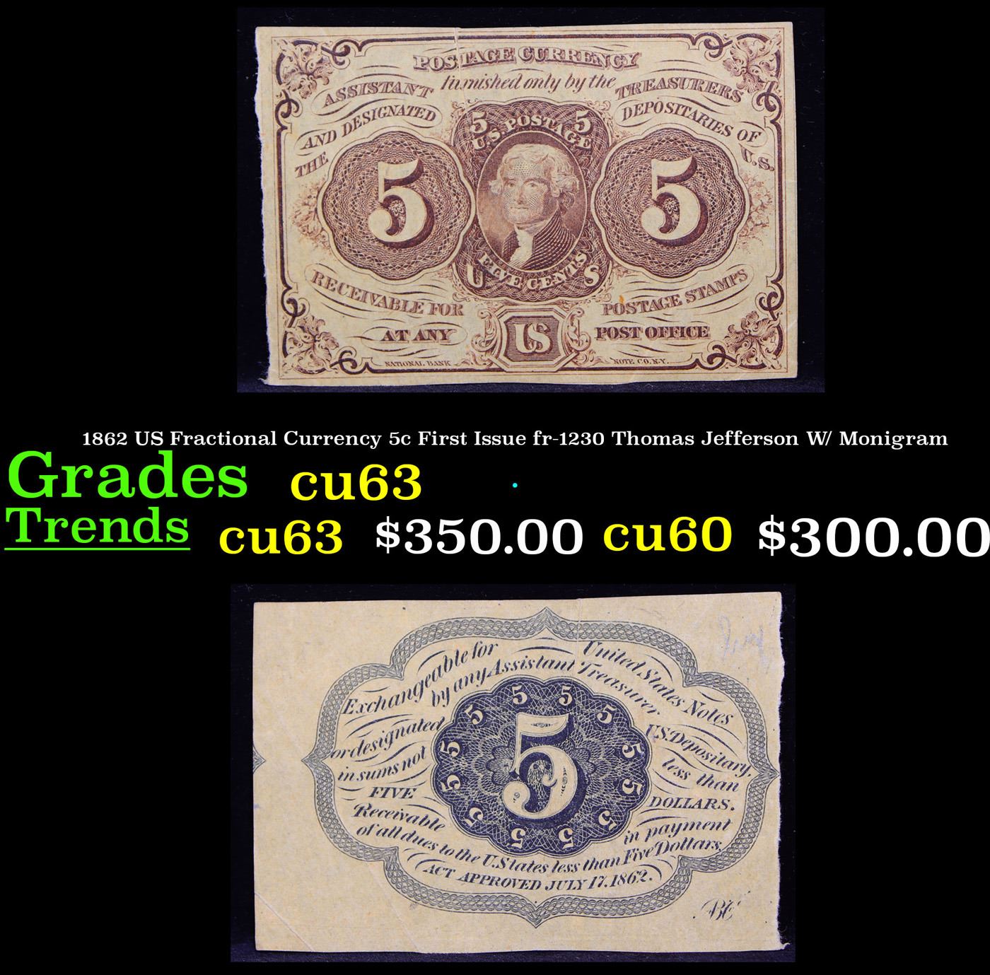 1862 US Fractional Currency 5c First Issue fr-1230 Thomas Jefferson W/ Monigram Grades Select CU. Fractional or postage currency has a rich history. At the beginning of the Civil War people starting hoarding coins for their precious metal content. Coins became difficult to find because of the hoarding. People started to try to use stamps instead of coins as a means of commerce. The government decided to help ease the hoarding issue by issuing “paper coins” also known as postage currency or fractional currency. Fractional currency was first issued on August 21, 1862 and they were last issued on February 15, 1876. Three cents, five cents, ten cents, twenty-five cents, and fifty cents notes were all issued. Fractional currency is physically smaller than other United States money. It also does not have a serial number.