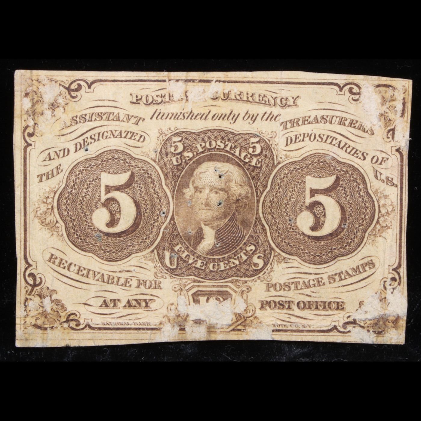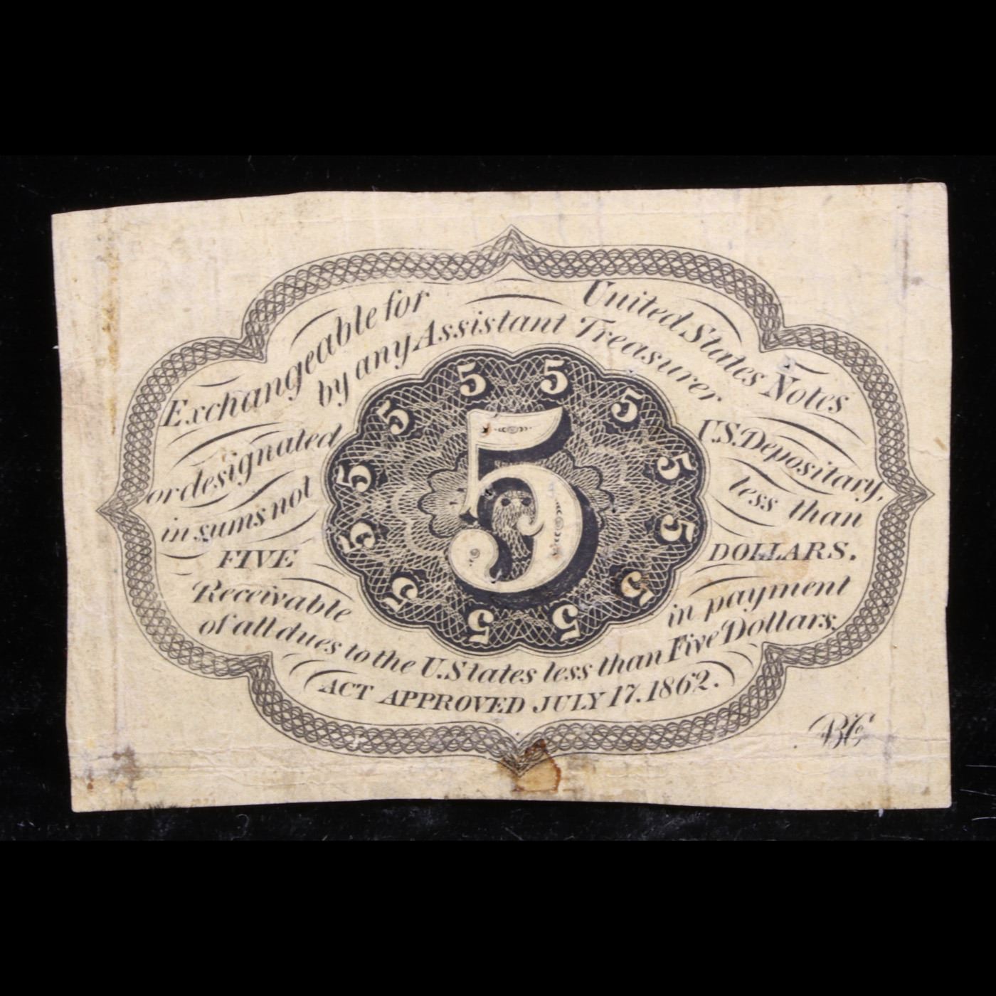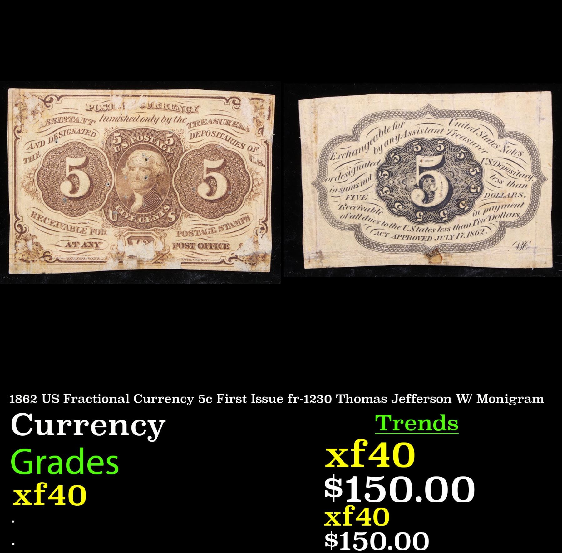 1862 US Fractional Currency 5c First Issue fr-1230 Thomas Jefferson W/ Monigram Grades xf. Fractional or postage currency has a rich history. At the beginning of the Civil War people starting hoarding coins for their precious metal content. Coins became difficult to find because of the hoarding. People started to try to use stamps instead of coins as a means of commerce. The government decided to help ease the hoarding issue by issuing “paper coins” also known as postage currency or fractional currency. Fractional currency was first issued on August 21, 1862 and they were last issued on February 15, 1876. Three cents, five cents, ten cents, twenty-five cents, and fifty cents notes were all issued. Fractional currency is physically smaller than other United States money. It also does not have a serial number.