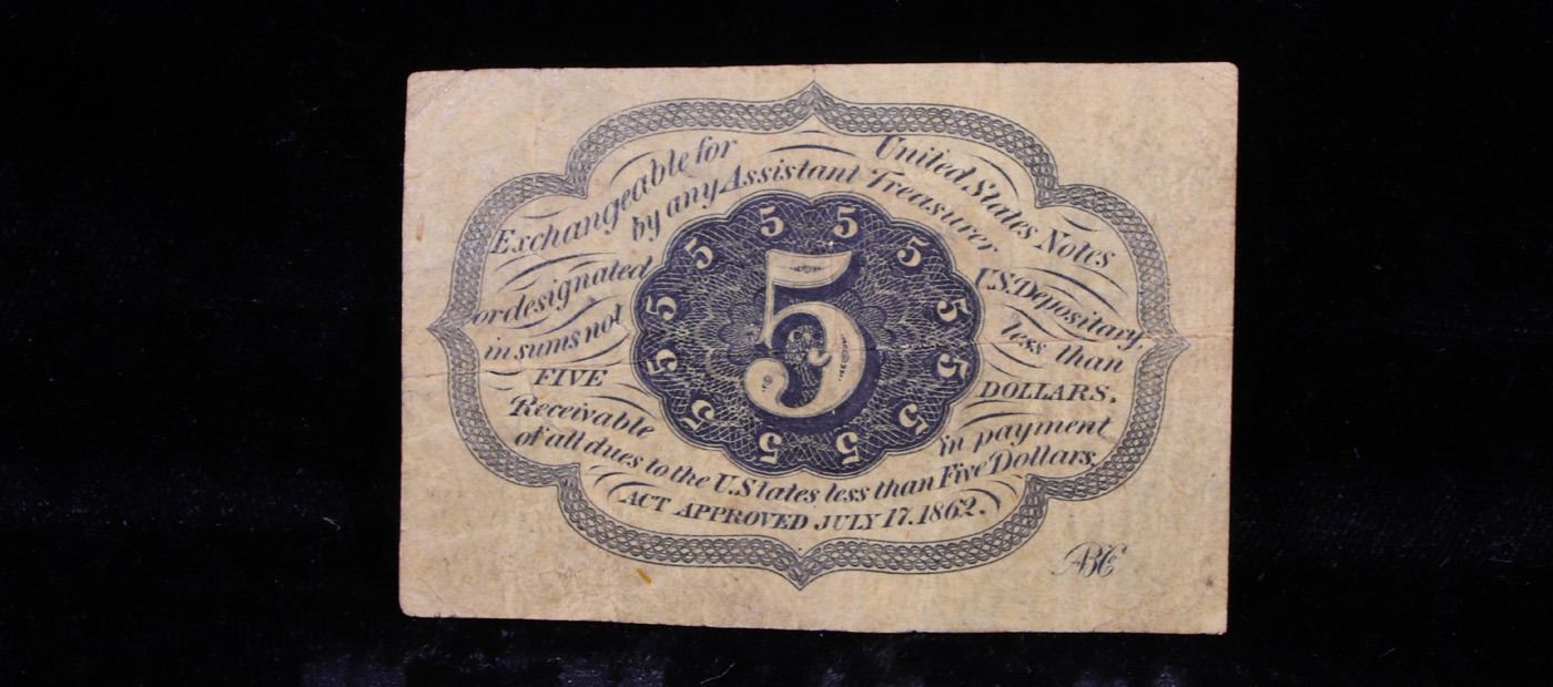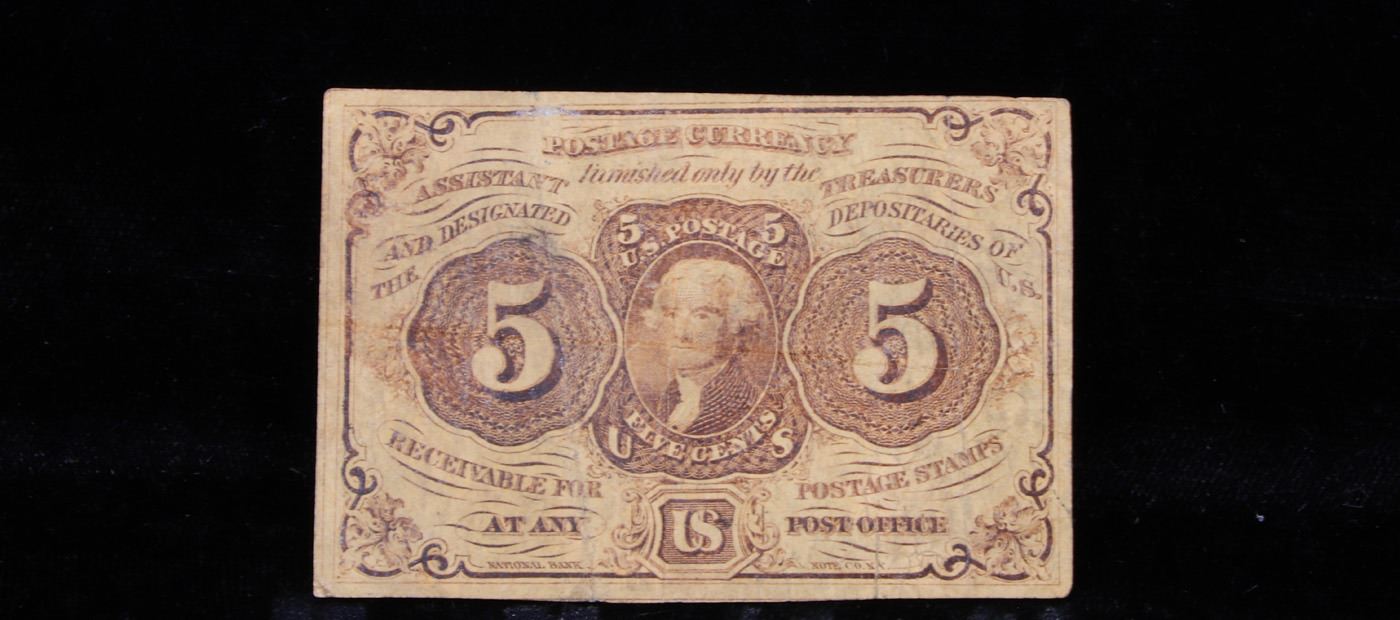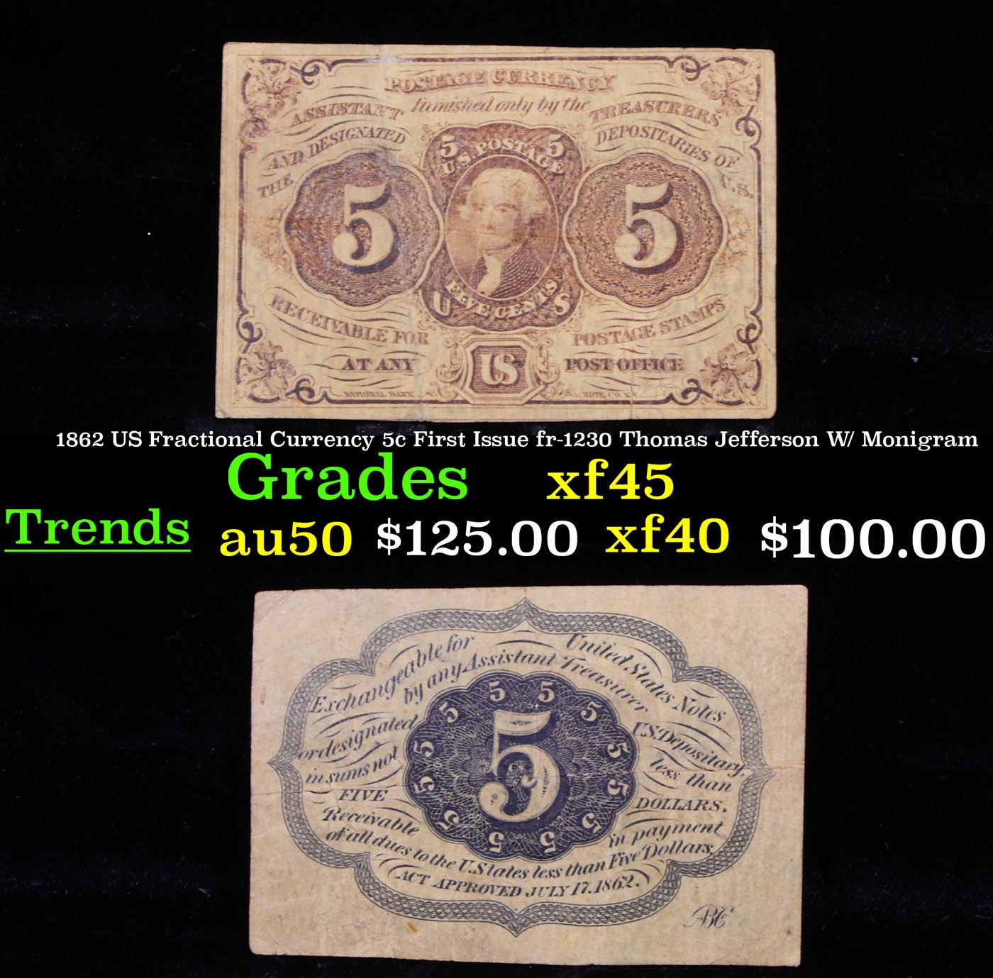 1862 US Fractional Currency 5c First Issue fr-1230 Thomas Jefferson W/ Monigram xf+. Fractional or postage currency has a rich history. At the beginning of the Civil War people starting hoarding coins for their precious metal content. Coins became difficult to find because of the hoarding. People started to try to use stamps instead of coins as a means of commerce. The government decided to help ease the hoarding issue by issuing “paper coins” also known as postage currency or fractional currency. Fractional currency was first issued on August 21, 1862 and they were last issued on February 15, 1876. Three cents, five cents, ten cents, twenty-five cents, and fifty cents notes were all issued. Fractional currency is physically smaller than other United States money. It also does not have a serial number.