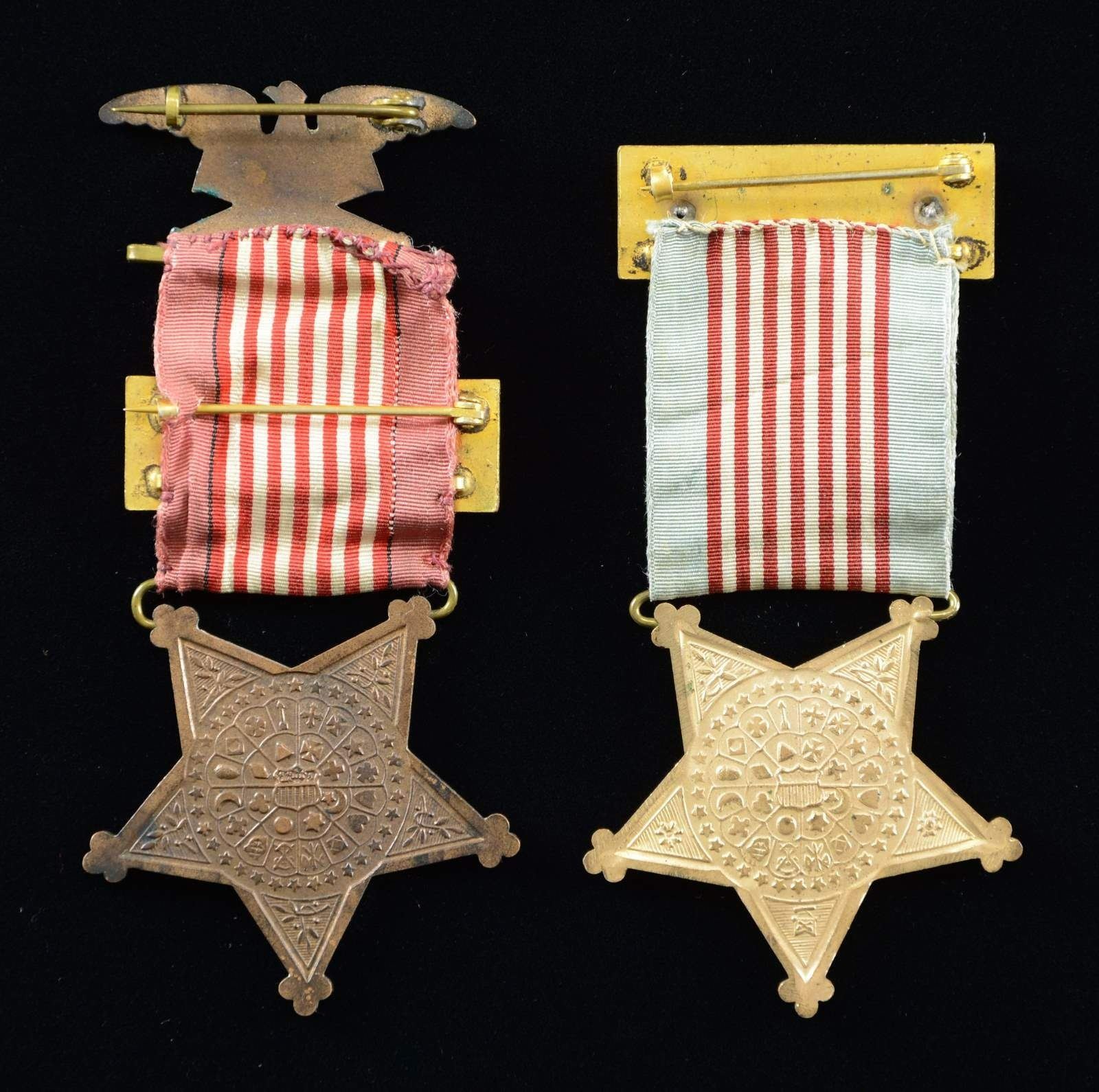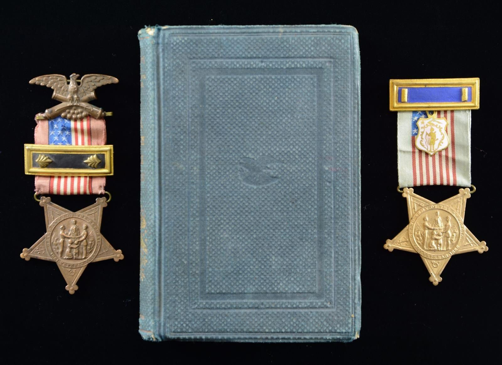 1) 1862 dated US Infantry Tactics manual. First page reads "[BY AUTHORITY.]/ U.S. INFANTRY TACTICS, FOR THE, INSTRUCTION, EXERCISE, AND MANEUVRES/ OF THE/ UNITED STATES INFANTRY, INCLUDING/ Infantry of the Line, Light Infantry, and Rifleman". CONDITION: exterior of book is good, with areas of wear showing through to mild crazing, but otherwise remains sturdy. Pages exhibit appropriate age related yellowing. 2) 2 GAR (Grand Army of the Republic) organization medals. The first with a gold and blue hanger with a shield portraying the silhouette of a bowman. The second with a patriotic eagle grasping crossed cannons. Medals both read "GRAND ARMY OF THE REPUBLIC/ 1861 VETERAN 1866". CONDITION: medals are good overall, with one exhibiting a pleasing dark patina. PROVENANCE: From the Lifelong Collection of Glen E. Mattox. (02-18389/MLW). $200-300.