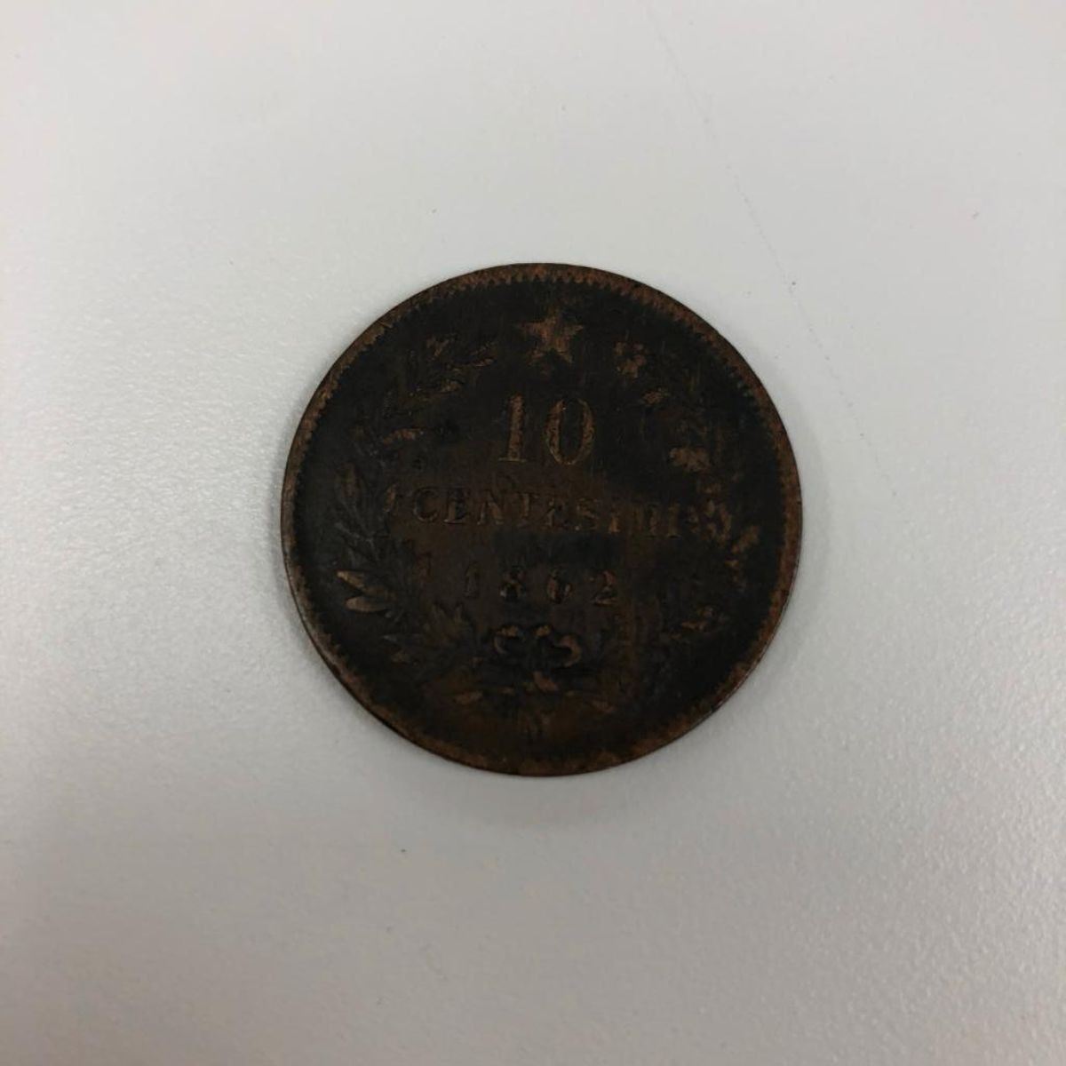 Obverse Head of King Vittorio Emanuele II left. Below the neck the name of the engraver. Lettering: VITTORIO EMANUELE II RE D'ITALIA FERRARIS Engraver: Giuseppe Ferraris Reverse Value and date within two branches, one of laurel and the other of oak. Above the Italy star and below the sign of the mint Mint marks: M for Milan (km# 11.1) no mint mark for Paris and Bruxelles (km# 11.2) H for Birmingham (km# 11.3) N for Naples (km# 11.4) OM or OM. or .OM. for Strasbourg (km# 11.5) T for Turin (km# 11.6) Lettering: 10 CENTESIMI 1862 M Engraver: Giuseppe Ferraris Specifications Country: Italy Type: Standard circulation coin Years: 1862-1867 Value: 10 Centesimi (0.1 ITL) Composition: Bronze Weight: 10 g Diameter: 30 mm Thickness: 1.50 mm Shape: Round
