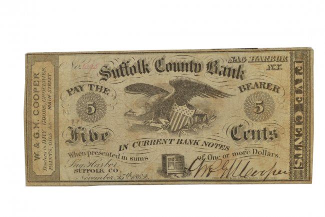 Sag Harbor, New York, November 25, 1862, on the Suffolk County Bank, #1095, signed Ferdinand Mayer & Co. imprint. Very Fine Condition.