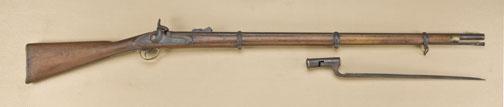 1862-dated British rifled musket, brass mounted, with English associated earlier socket bayonet and period cleaning rod. The lock shows crown at rear, good 1862 and Tower markings, British proofs, and “24” onbreech. The right side of buttstock is carved with initials “AW”, the stock has been lightly sanded and the markings in the stock not visible. The metal surfaces show a dark brown to black patina with some scatteredlight to heavy pitting, heavier pitting in the area of the breech. The hammer screw is replaced with a copper screw. The swivel has been removed. The gun has been bored out to .62 smooth. A matching patina British bayonet from a .69 caliber matches and seems to have been always with it. Many of these used in the Civil War. Est: $800 - $1,600