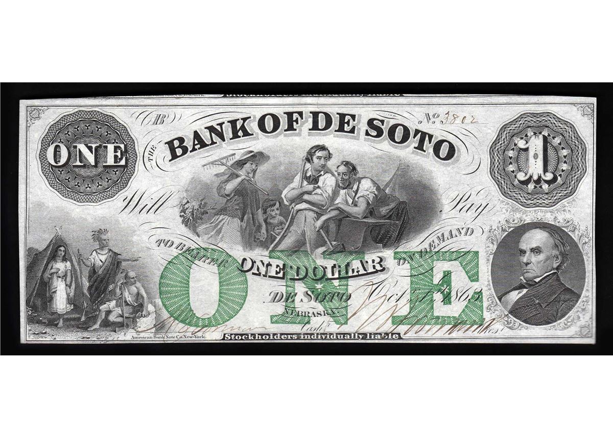 One 1863 $1 Bank of De Soto Nebraska Obsolete Bank Note.