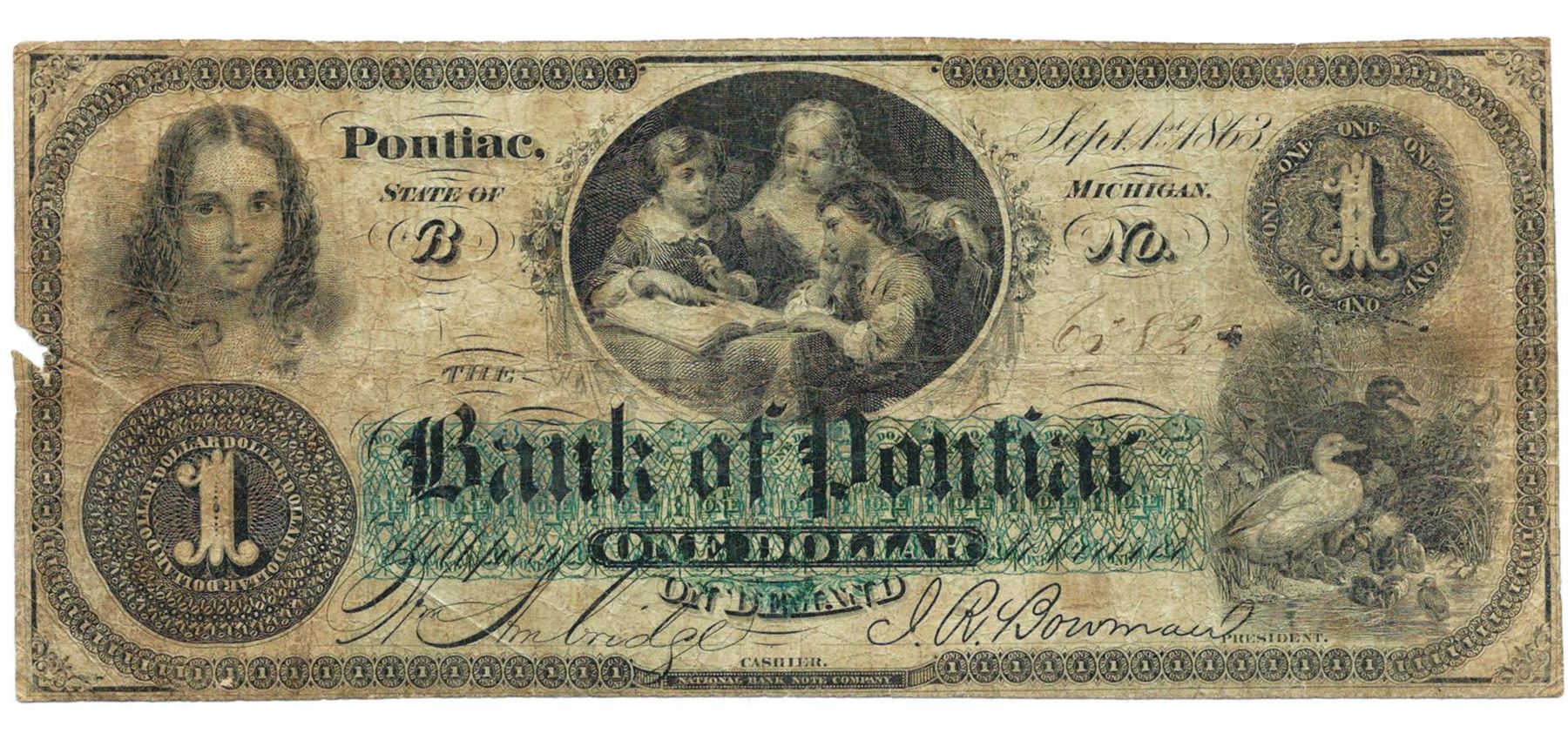 One 1863 $1 Bank of Pontiac, Pontiac, MI Bank Note - Scarce - Tear