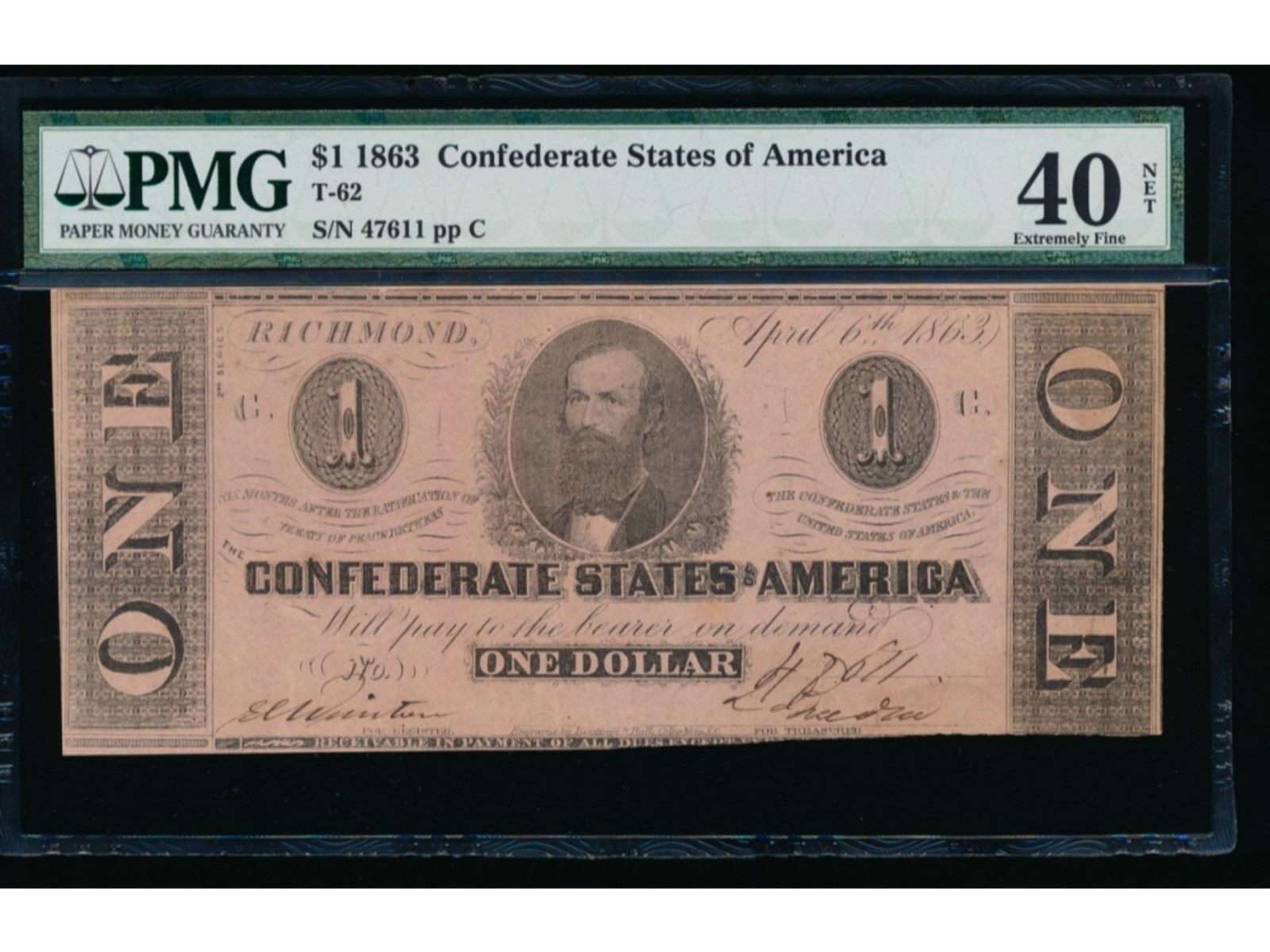 One 1863 $1 Confederate States of America Note PMG 40NET.