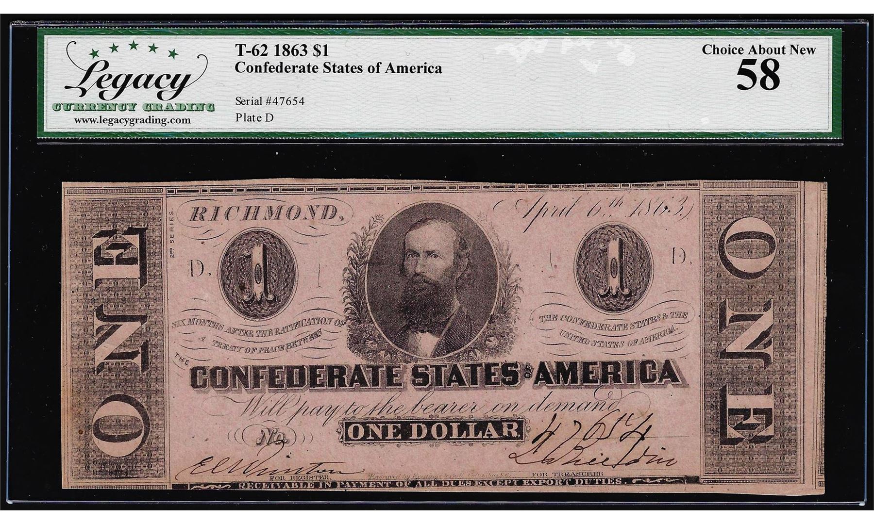1863 $1 Confederate States of America Note T-62 Legacy Choice About New 58