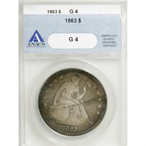 <B>1863 $1 G4 ANACS.</B></I> NGC Census: (0/66). PCGS Population (0/107). Mintage: 27,200. Numismedia Wsl. Price for NGC/PCGS coin in G4 : $275. (#6953)<BR><BR><B>Coin Engraver:</B> Christian Gobrecht<BR><BR><b>Shipping:</b> Coins & Currency (<a target="_blank" href="http://www.heritageauctions.com/common/shipping.php">view shipping information</a>)