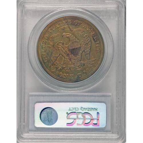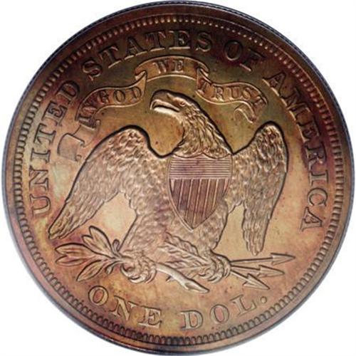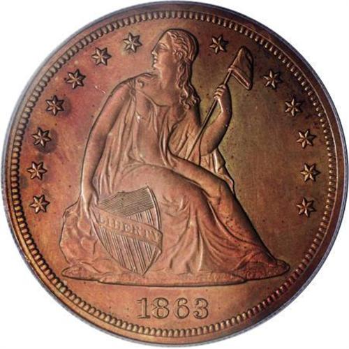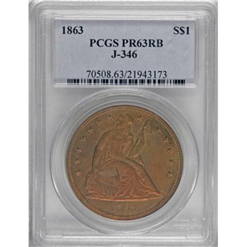 <B>1863 $1 Dollar, Judd-346, Pollock-418, Low R.7, PR63 Red and Brown PCGS.</B></I> A regular issue 1863 Seated Liberty obverse die is muled with a regular issue Motto reverse die. Struck in copper with a reeded edge. Per uspatterns.com, "These and the other "with motto" patterns of this date and also 1864 and possibly 1865 are actually restrikes made circa 1869 and into the early 1870s and were offered with restrikes of the other denominations in complete sets." This fully struck specimen is ruby-red and orange with glimpses of olive toning. Each side has a few minute carbon flecks, visible beneath a loupe. Seated dollar patterns are invariably rare, and remain highly popular.<BR><BR><b>Shipping:</b> Coins & Currency (<a target="_blank" href="http://www.heritageauctions.com/common/shipping.php">view shipping information</a>)