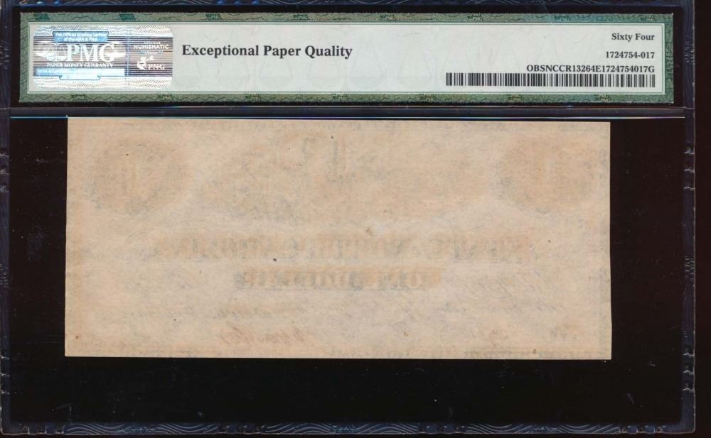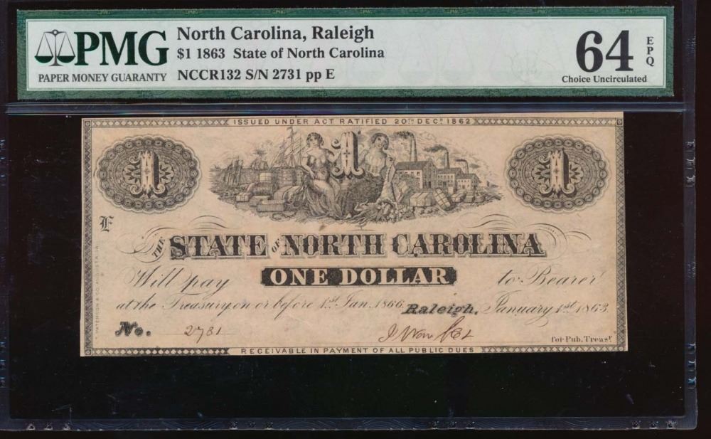 One 1863 $1 North Carolina Obsolete Note PMG 64EPQ.