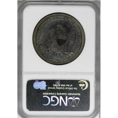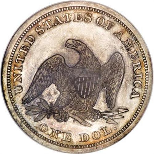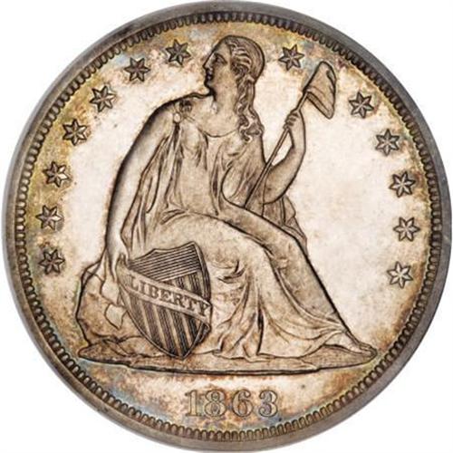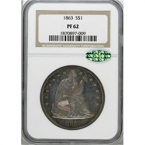 <B>1863 $1 PR62 NGC. CAC.</B></I> The somewhat grainy obverse central device stands out against the mirrored fields, and all design elements exhibit excellent delineation. Splashes of cobalt-blue and russet visit portions of both sides, each of which reveal a few barely discernible handling marks. <BR><I>From The Queller Family Collection of Silver Dollars.</B></I><BR><BR><B>Coin Engraver:</B> Christian Gobrecht<BR><BR><b>Shipping:</b> Coins & Currency (<a target="_blank" href="http://www.heritageauctions.com/common/shipping.php">view shipping information</a>)